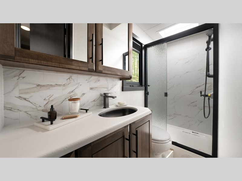 Sleeps 4 Length 30 ft 2 in Ext Width 8 ft 5 in Ext Height 12 ft Int Height 7 ft Interior Color Cold Spring, Warm River Exterior Color Backwoods Desertscape, Full-Body Paint: Desert Dune, Parched Earth, Spring Rain, Alpine Byrum Hitch Weight 12000 lbs GVWR 19500 lbs Fresh Water Capacity 72 gals Grey Water Capacity 43 gals Black Water Capacity 43 gals Tire Size 245/70R19.5 Furnace BTU 30000 btu Generator 6,000W Diesel Fuel Type Diesel Engine 6.7L Power Stroke V8 Chassis Ford F550 4X4 Horsepower 330 hp Fuel Capacity 67 gals Wheelbase 205 in Number Of Bunks 1 Torque 950 ft-lb Refrigerator Type 12V Refrigerator Size 10 cu ft Convection Cooking Yes Cooktop Burners 2 Shower Size 26" x 36" Number of Awnings 1 Axle Weight Front 7000 lbs Axle Weight Rear 14706 lbs LP Tank Capacity 24.5 gal. Water Heater Capacity 10 gal Water Heater Type Gas/Electric AC BTU 28500 btu TV Info LR 39" LED HD Smart TV on Lift, Ext. LED HD Smart TV Awning Info 18' Electric Legless with LED Lights Gross Combined Weight 31500 lbs Shower Type Standard Electrical Service 50 amp Similar Floorplans