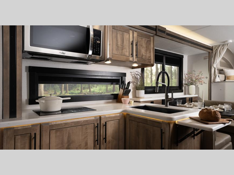 - LED-lit, solid-surface kitchen countertops; Pull-out countertop extension (select models)