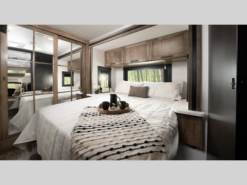 Sleeps 6 Slides 2 Length 34 ft 3 in Ext Width 8 ft 5 in Ext Height 12 ft Int Height 7 ft Interior Color Cold Spring, Warm River Exterior Color Backwoods Desertscape, Full-Body Paint: Desert Dune, Parched Earth, Spring Rain, Alpine Byrum Hitch Weight 12000 lbs GVWR 22000 lbs Fresh Water Capacity 60 gals Grey Water Capacity 38 gals Black Water Capacity 30 gals Tire Size 245/70R19.5 Furnace BTU 30000 btu Generator 6,000W Diesel Fuel Type Diesel Engine 6.7L Power Stroke V8 Chassis Ford F600 4X4 Horsepower 330 hp Fuel Capacity 67 gals Wheelbase 227 in Number Of Bunks 1 Available Beds King Torque 950 ft-lb Refrigerator Type Residential Refrigerator Size 18 cu ft Convection Cooking Yes Cooktop Burners 2 Shower Size 30" x 36" Number of Awnings 1 Axle Weight Front 7500 lbs Axle Weight Rear 15500 lbs LP Tank Capacity 24.5 gal. Water Heater Capacity 10 gal Water Heater Type Gas/Electric AC BTU 28500 btu TV Info LR 50" LED HD Smart TV on Lift, BR LED HD Smart TV, Ext. LED HD Smart TV Awning Info 20' Electric Legless with LED Lights Gross Combined Weight 34000 lbs Shower Type Standard Electrical Service 50 amp Similar Floorplans