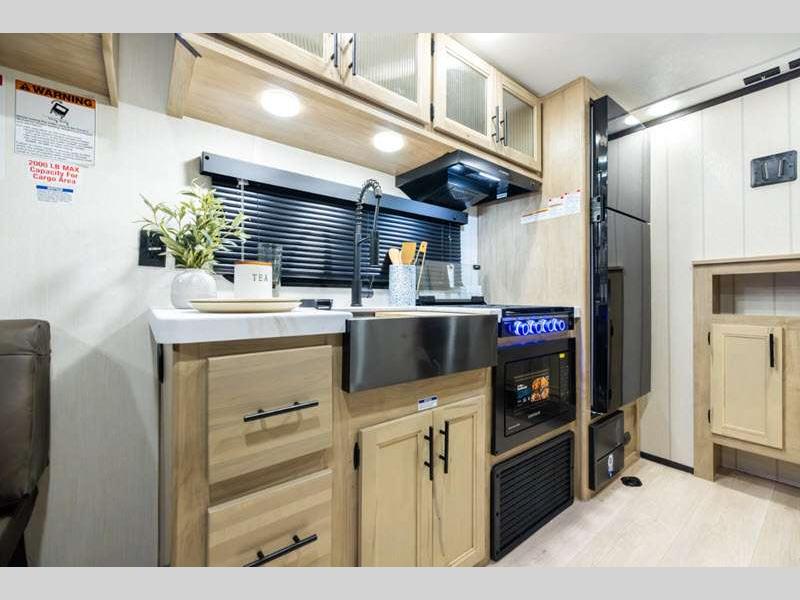 Sleeps 6 Slides 1 Length 34 ft 2 in Ext Width 8 ft Ext Height 10 ft 8 in Int Height 0 ft Hitch Weight 1183 lbs GVWR 9995 lbs Dry Weight 6924 lbs Cargo Capacity 3071 lbs Fresh Water Capacity 52 gals Grey Water Capacity 38 gals Black Water Capacity 38 gals Furnace BTU 20000 btu Available Beds RV King Refrigerator Type 12V Cooktop Burners 3 Number of Awnings 1 Garage Size 11 ft Water Heater Type Tankless AC BTU 15000 btu Awning Info 15' Full Length Power w/LED Light Strip Axle Count 2 Shower Type Standard Solar Wattage 200 watts Similar Floorplans