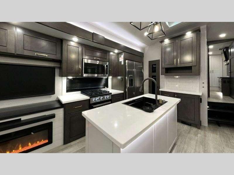 Sleeps 4 Slides 5 Length 43 ft 11 in Ext Width 8 ft 6 in Ext Height 13 ft 3 in Int Height 8 ft 6 in Interior Color Stonewall Gray Exterior Color Opt. Full Body Paint (Ash, Shadow, Glacier Blue) Hitch Weight 3090 lbs GVWR 17995 lbs Dry Weight 15645 lbs Cargo Capacity 2350 lbs Fresh Water Capacity 75 gals Grey Water Capacity 74 gals Black Water Capacity 74 gals Tire Size 215/75R17.5H Furnace BTU 40000 btu Available Beds King Refrigerator Type Residential Refrigerator Size 21 cu ft Convection Cooking Yes Cooktop Burners 4 Shower Size 36" x 48" Number of Awnings 2 Axle Weight 8000 lbs LP Tank Capacity 90 Lbs. Water Heater Type On Demand Tankless AC BTU 30000 btu TV Info LR 4K Smart LED HDTV, BR 32" 4K Smart TV Awning Info 14' & 14' Electric w/ Integrated RGB LED Lights Axle Count 2 Washer/Dryer Available Yes Shower Type Shower w/Seat Solar Wattage 400 watts Similar Floorplans