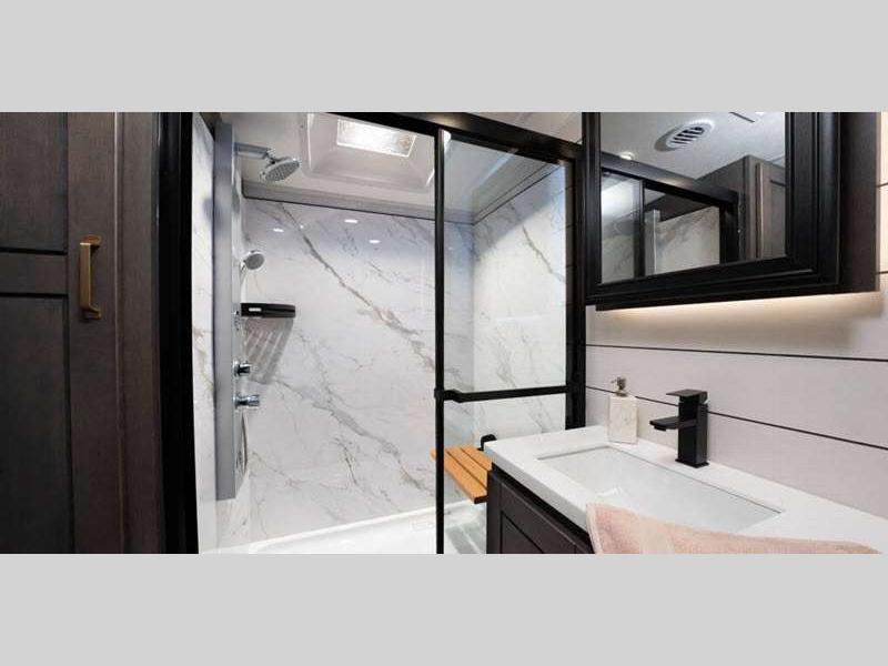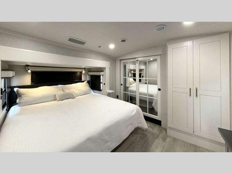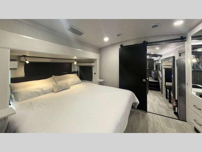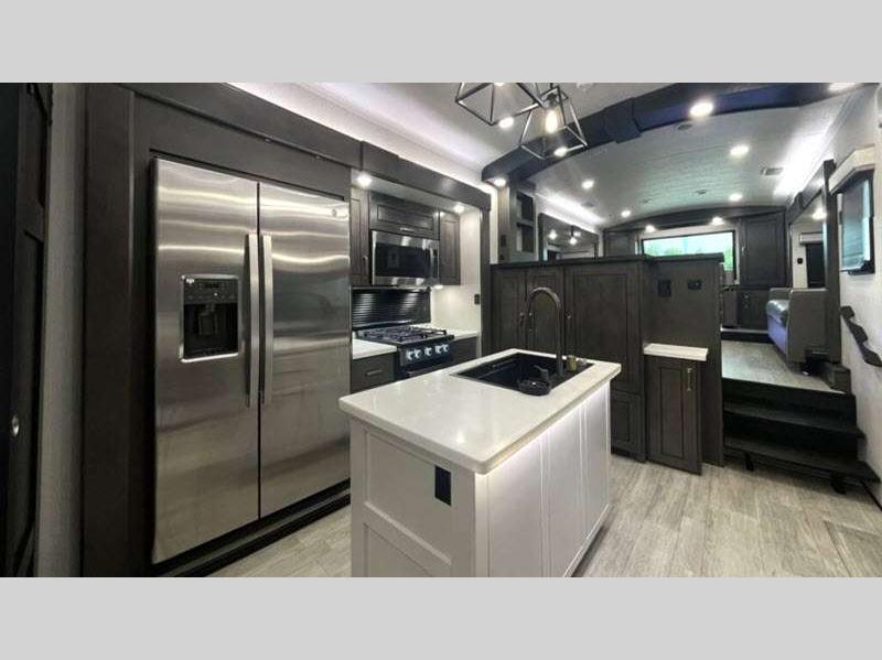 Sleeps 4 Slides 3 Length 36 ft 1 in Ext Width 8 ft 6 in Ext Height 13 ft 3 in Int Height 8 ft 6 in Interior Color Stonewall Gray Exterior Color Opt. Full Body Paint (Ash, Shadow, Glacier Blue) Hitch Weight 2405 lbs GVWR 16000 lbs Dry Weight 13060 lbs Cargo Capacity 2940 lbs Fresh Water Capacity 75 gals Grey Water Capacity 87 gals Black Water Capacity 50 gals Tire Size 215/75R17.5H Furnace BTU 40000 btu Available Beds King Refrigerator Type Residential Refrigerator Size 21 cu ft Convection Cooking Yes Cooktop Burners 4 Shower Size 36" x 48" Number of Awnings 2 Axle Weight 7000 lbs LP Tank Capacity 90 Lbs. Water Heater Type On Demand Tankless AC BTU 30000 btu TV Info LR 4K Smart LED HDTV, BR 32" 4K Smart TV Awning Info 10' & 16' Electric w/ Integrated RGB LED Lights Axle Count 2 Washer/Dryer Available Yes Shower Type Walk-In Shower Solar Wattage 400 watts Similar Floorplans