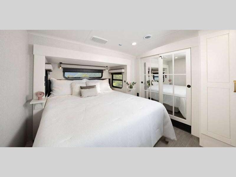 Sleeps 4 Slides 4 Length 42 ft 6 in Ext Width 8 ft 6 in Ext Height 13 ft 3 in Int Height 8 ft 6 in Interior Color Stonewall Gray Exterior Color Opt. Full Body Paint (Ash, Shadow, Glacier Blue) Hitch Weight 2970 lbs GVWR 17995 lbs Dry Weight 15275 lbs Cargo Capacity 2720 lbs Fresh Water Capacity 75 gals Grey Water Capacity 137 gals Black Water Capacity 50 gals Tire Size 215/75R17.5H Furnace BTU 40000 btu Available Beds King Refrigerator Type Residential Refrigerator Size 21 cu ft Convection Cooking Yes Cooktop Burners 4 Shower Size 36" x 48" Number of Awnings 2 Axle Weight 8000 lbs LP Tank Capacity 90 Lbs. Water Heater Type On Demand Tankless AC BTU 30000 btu TV Info LR 4K Smart LED HDTV, BR 32" 4K Smart TV Awning Info 15' & 17' Electric w/ Integrated RGB LED Lights Axle Count 2 Washer/Dryer Available Yes Shower Type Walk-In Shower Solar Wattage 400 watts Similar Floorplans