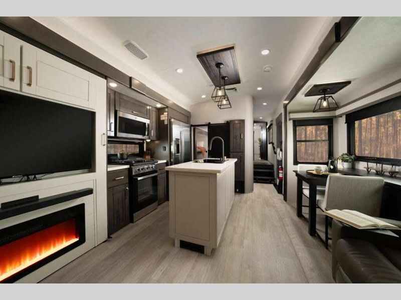 Sleeps 4 Slides 3 Length 40 ft 5 in Ext Width 8 ft 6 in Ext Height 13 ft 3 in Int Height 8 ft 4 in Interior Color Stonewall Gray Exterior Color Opt. Full Body Paint (Ash, Shadow, Glacier Blue) Hitch Weight 2600 lbs GVWR 17300 lbs Dry Weight 14465 lbs Cargo Capacity 2835 lbs Fresh Water Capacity 75 gals Grey Water Capacity 82.5 gals Black Water Capacity 50 gals Tire Size 215/75R17.5H Furnace BTU 40000 btu Available Beds King Refrigerator Type Residential Refrigerator Size 21 cu ft Convection Cooking Yes Cooktop Burners 4 Shower Size 36" x 48" Number of Awnings 2 Axle Weight 8000 lbs LP Tank Capacity 90 Lbs. Water Heater Type On Demand Tankless AC BTU 30000 btu TV Info LR 4K Smart LED HDTV, BR 32" 4K Smart TV Awning Info 15' & 16' Electric w/ Integrated RGB LED Lights Axle Count 2 Washer/Dryer Available Yes Shower Type Walk-In Shower Solar Wattage 400 watts Similar Floorplans